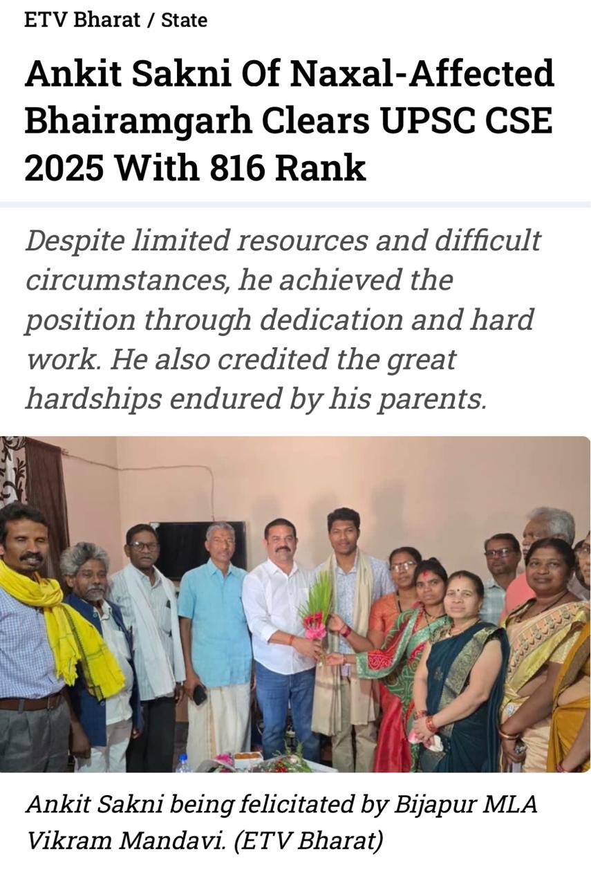 रायपुर, छत्तीसगढ़ के नक्सल प्रभावित क्षेत्र भैरमगढ़ के निवासी अंकित सकनी ने संघ लोक सेवा आयोग (यूपीएससी) सिविल सेवा परीक्षा 2025 में 816वीं रैंक प्राप्त कर क्षेत्र और राज्य का नाम रोशन किया है। सीमित संसाधनों और चुनौतीपूर्ण परिस्थितियों के बावजूद उन्होंने अपने परिश्रम, धैर्य और संकल्प के बल पर यह महत्वपूर्ण सफलता हासिल की।मुख्यमंत्री श्री विष्णुदेव साय, मंत्री श्री रामविचार नेताम और विभाग के प्रमुख सचिव श्री सोनमणि बोरा ने अंकित के इस सफलता के लिए बधाई और शुभकामनाएं दी हैं।