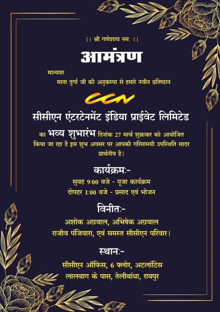 राजधानी रायपुर में सीसीएन एंटरटेनमेंट इंडिया प्राइवेट लिमिटेड एक और कदम बढ़ा रहा है जहां नई ब्रांच की शुरुआत राजधानी रायपुर में हो रही है जिसका शुभारंभ 27 मार्च दिन शुक्रवार को हो रहा है जहां एंटरटेनमेंट की दुनिया में सीसीएन एक अलग ही छाप छोड़ चूका है जहां बीते 4 दशकों से दर्शकों के लिए एंटरटेनमेंट के रूप में एक अलग ही पहचान बना रखी है सीसीएन एक ब्रांड नेम है जिन्होंने डिजिटल युग कि शुरुआती समय में राजधानी रायपुर में डिजिटीलाइजेशन का काम शुरू किया उनके डायरेक्टर श्री अशोक अग्रवाल जी अनुभव और कुशल नेतृत्व क्षमता रखने वाले अनुभवी डायरेक्टर है जिन्होंने छत्तीसगढ़ के केबल व्यवसाईयों को एक नई ऊर्जा दी है आज केबल व्यवसायी और व्यवसाय को बचाने के लिए लगातार सीसी एन संघर्ष कर रहा है बड़ी-बड़ी कंपनियों से लोहा ले रहा है और आज भी विपरीत परिस्थितियों के बावजूद स्थापित खड़ा है