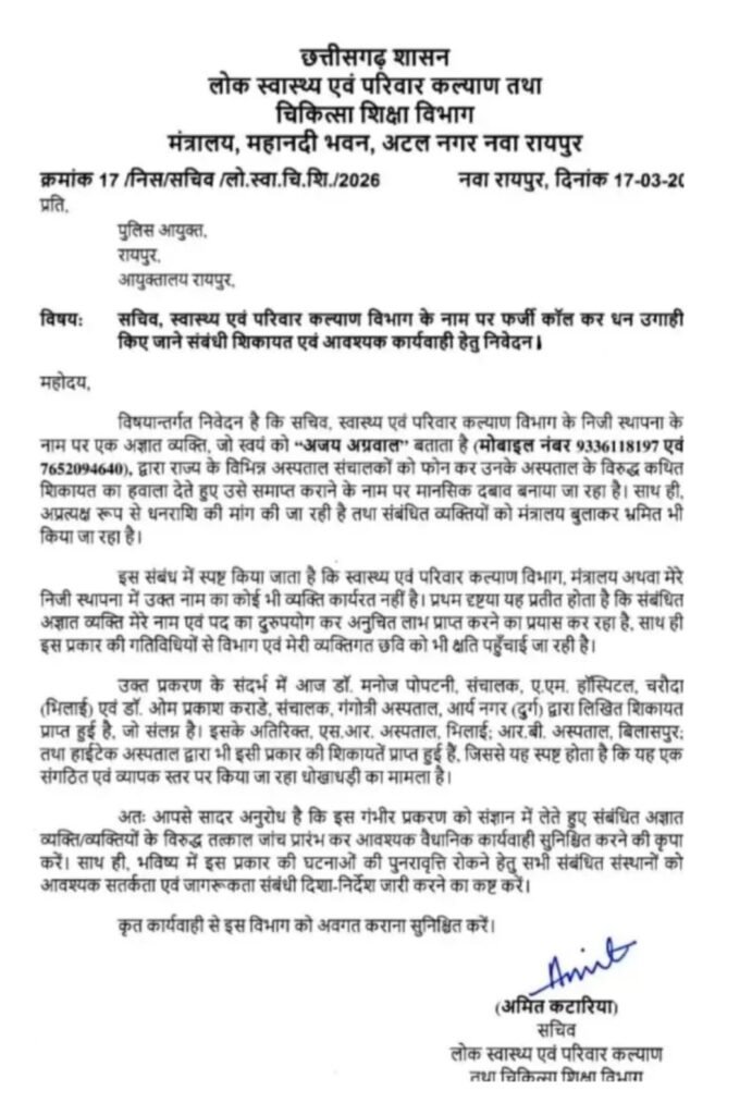 स्वास्थ्य एवं परिवार कल्याण विभाग के नाम पर फर्जी कॉल कर निजी अस्पतालों से पैसे की उगाही की शिकायत सामने आई है, आरोपी खुद को विभाग से जुड़ा बताने वाले अज्ञात व्यक्ति स्वयं को अजय अग्रवाल बताता है,अग्रवाल अस्पताल संचालकों को कॉल कर उन्हें जांच, कार्रवाई या अन्य प्रशासनिक दबाव का डर दिखाकर पैसे की मांग कर रहे थे इस मामले में कई निजी अस्पतालों ने लिखित शिकायत भी दी है,जिसके बाद स्वास्थ्य सचिव अमित कटारिया ने पुलिस से जांच और कड़ी कार्रवाई की मांग की है,
